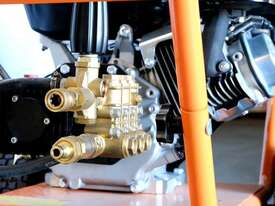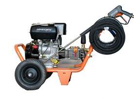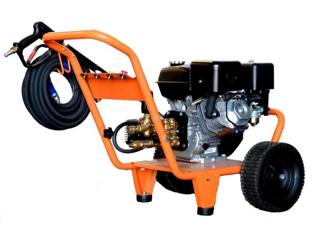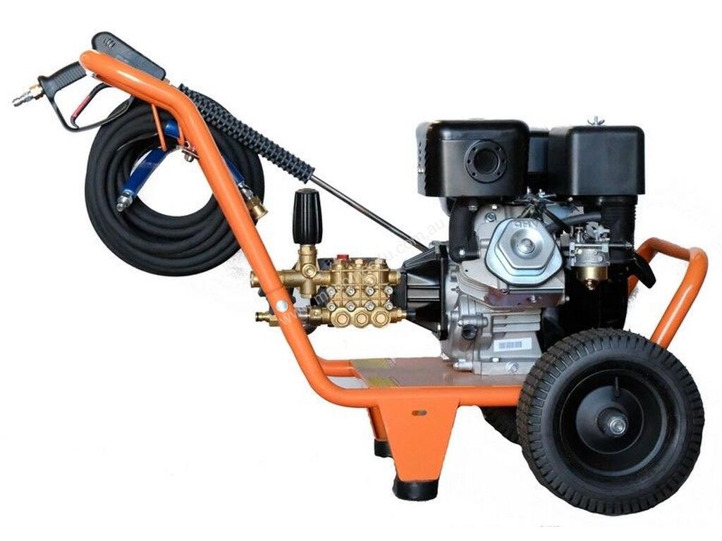 This pressure washer is cold water only pressure washer rated to 4000PSI. The pressure pump is fitted with quality seals and ceramic pistons. The pressure regulator is fully adjustable from tap pressure to the maximum.The pump is coupled to a 15HP Single Cylinder air-cooled petrol engine.The unit is on a sturdy two wheel trolley and is supplied with wand, lance, 15 metre hose and four different nozzles. Â These range from a detergent nozzle to a pencil jet nozzle to remove serious baked on grime. We sell turbo nozzles as well.